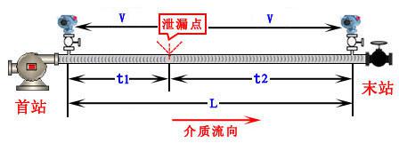 注:管道長(zhǎng)度L、聲波傳波速度V、t1-t2為首末、站次生波接收時(shí)間差。