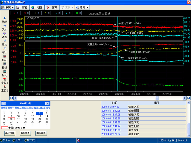 2009年3月6日7時43分37秒東十六-升382站-榆二聯(lián)輸油管線發(fā)生泄漏,系統(tǒng)在7時44分09秒發(fā)出報警,50秒后值班人員進行確認。系統(tǒng)定位泄漏位置在距東十六3.41公里處。