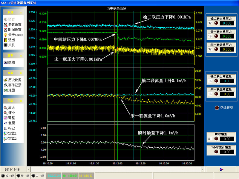 榆宋線2011年11月16日泄漏報(bào)警曲線圖