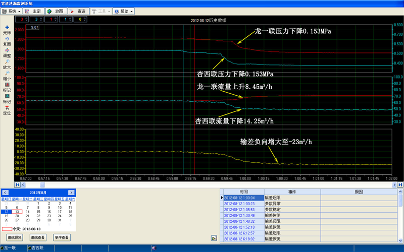 2012年8月12日龍一聯(lián)-杏西聯(lián)管線泄漏報(bào)警曲線圖