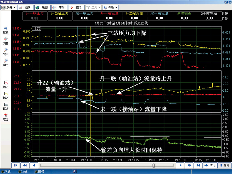 升一聯(lián)-升22站-宋一聯(lián)管線07年4月23日泄漏的報警曲線圖
