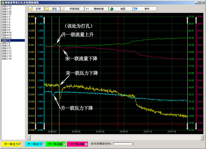 升宋線2006年7月4日23時50分發(fā)生泄漏,以下為該次泄漏的報警曲線及定位圖。