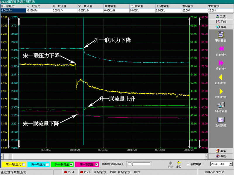 升一聯(lián)-宋一聯(lián)輸油管線全長(zhǎng)25.73㎞,管徑ф159㎜,中間設(shè)有加熱站,03年8月安裝LD-SAKER管道泄漏監(jiān)測(cè)報(bào)警定位系統(tǒng)。