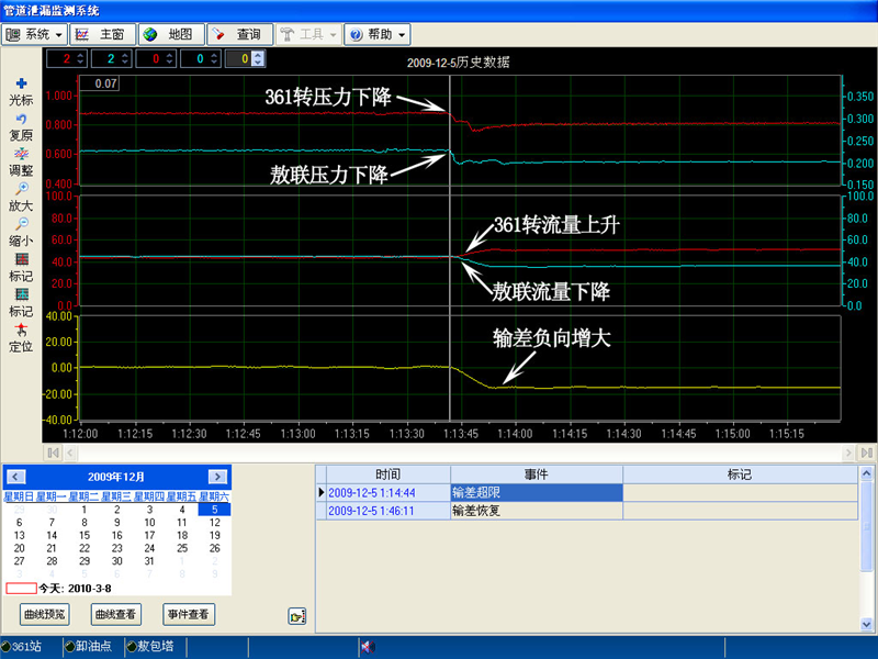 2009年12月25日1時13分41秒,361轉(zhuǎn)油站-敖包塔聯(lián)合站輸油管線發(fā)生泄漏。1時14分44秒系統(tǒng)發(fā)出報警提示,系統(tǒng)定位在距361轉(zhuǎn)5.56㎞處。