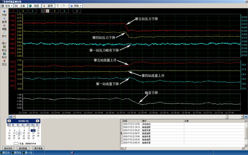 2020年7月10日22時35分26秒發(fā)生泄漏,36分30秒系統(tǒng)報警,系統(tǒng)定位在距肇五站1.6公里處。23時39分22秒關(guān)閥,該次泄漏歷時1小時3分56秒,瞬時泄漏量約1.9m3/h,累計泄漏2.02m3。