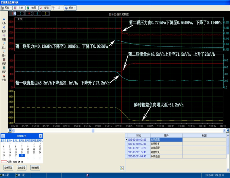 2018年2月28日8時59分28秒泄漏開始,系統(tǒng)于9時01分05秒報警,瞬時泄漏量達到51.2m3/h,定位在距葡二聯(lián)10.71公里處。工作人員處理快速,在9時06分45秒停外輸泵,從報警到挺輸僅用時5分40秒。