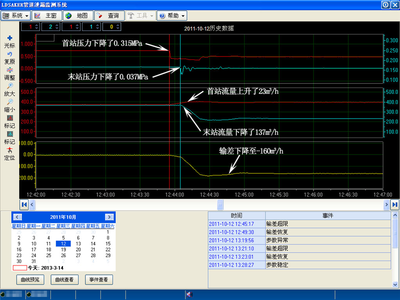 大慶油田某采油廠A站-B站輸油管線長17.3㎞,管徑ф429㎜,日輸原油12000m3。 2006年11月安裝LD-SAKER管道泄漏監(jiān)測系統(tǒng)。2011年10月12日12時43分55秒發(fā)生泄漏:系統(tǒng)在45分17秒報警,定位泄漏位置在距首站3.67公里處,管理部門處理果斷、及時,整個過程僅用時3分53秒,將損失降到了*小。此次泄漏因挖掘機施工造成,平均瞬時泄漏量約160m3/h。